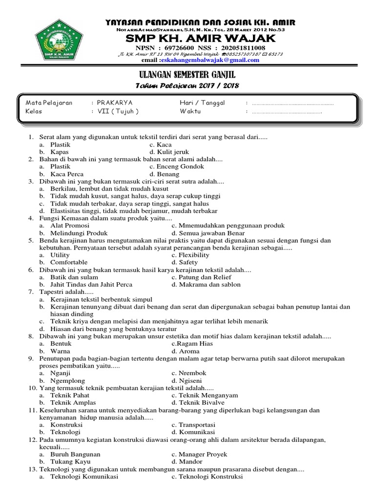Latihan soal bab 1 dan 2 prakarya kls 7. Contoh soal beserta jawaban dibuat dengan niat membantu belajar para peserta didik. Soal pilihan ganda bahasa indonesia kelas 7 semester 2 1. Jika terdapat kesalahan baik secara redaksional maupun kesalahan substansial, hal tersebut terjadi karena human error semata dan kerugian atasnya bukan merupakan tanggung jawab kami. Manfaat lain yang diperoleh peserta didik adalah adanya.